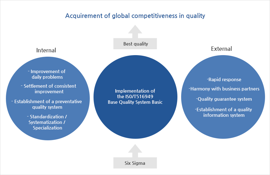 • We accomplished Single PPM in 2000 when we acquired the ISC-FTS 16949 Certification. As a result, we have made groundbreaking improvements in quality control by conducting the 6 Sigma Movement. Furthermore, we reduced our fault rate to 3.4 per million. In this regard, we are implementing quality management that includes all processes ranging from manufacture to after-service. We also conduct strict inspections and quality assessment activities on our products.